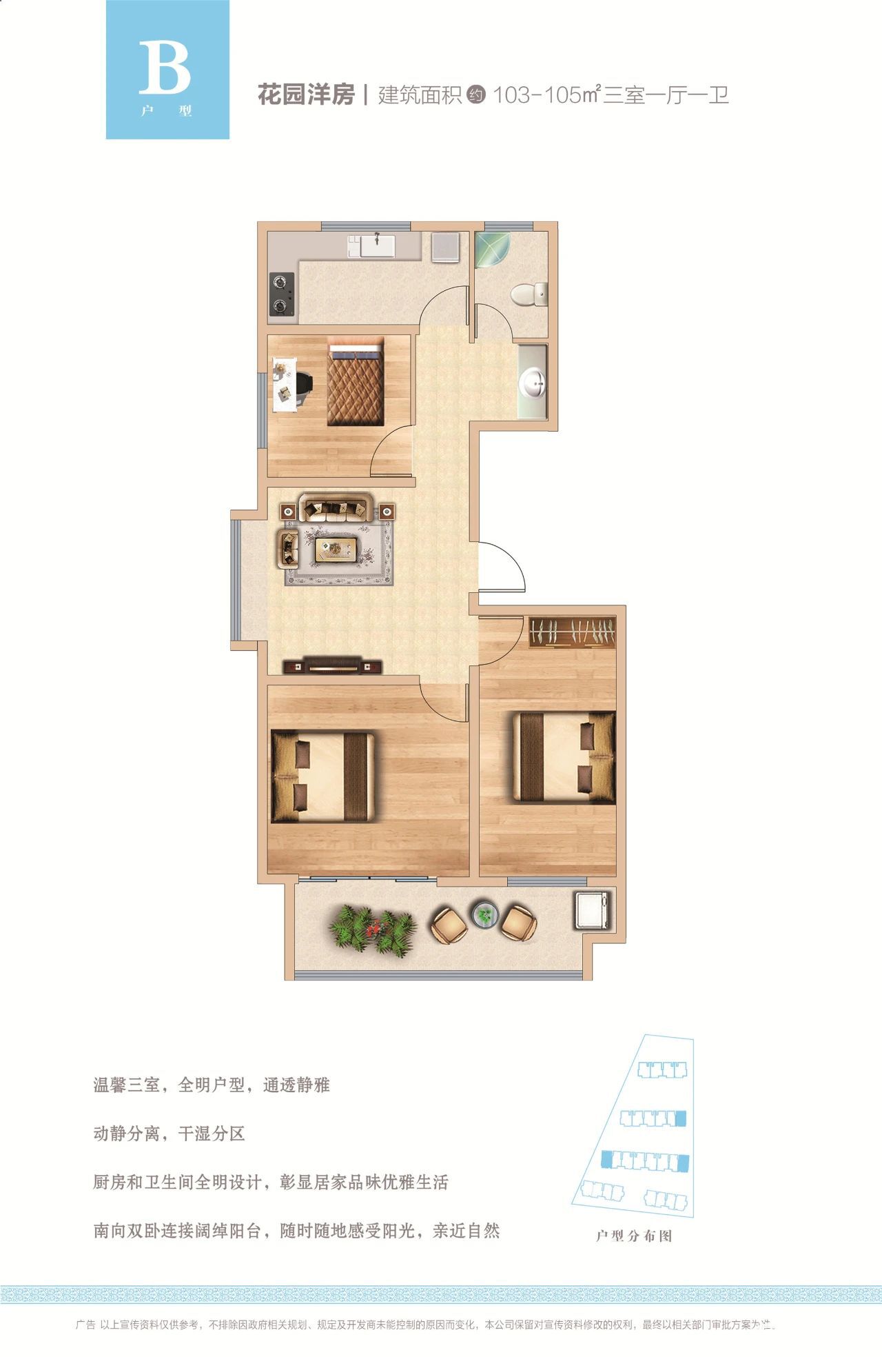 B户型:约102-104㎡ 三室两厅,全明设计,动静分离