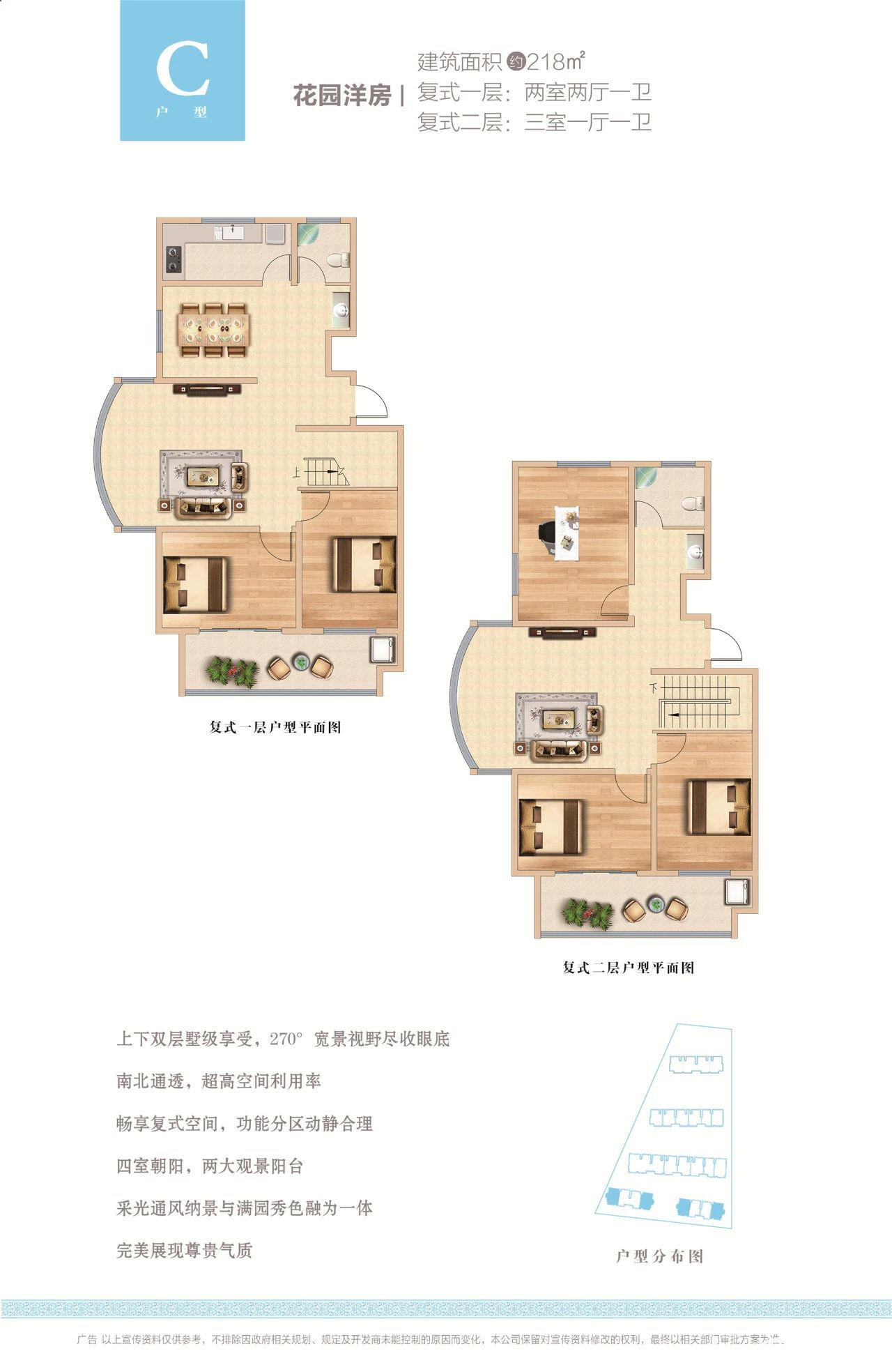 C户型:约218㎡ 复式结构,四室朝阳,空间利用率高