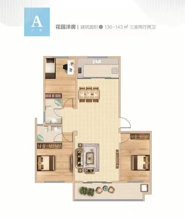 主力户型:约136-143㎡ 三室两厅两卫,客厅餐厅一体化
