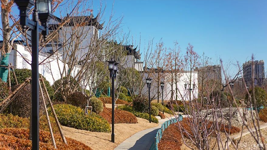 水景、连廊、亭子等土建基础完成约 90%。水电预埋完成约70%,古建主框架龙骨完成约40%。园路铺装垫层完成,围墙砌体二次结构完成约 95%,抛枋完成约20%-40%。