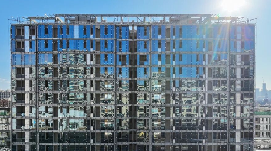 B1#、B2#:玻璃幕墙龙骨安装完成,开启扇龙骨完成约90%;石材安装完成约 90%;檐口及雨儿墙铝板安装完毕;内墙抹灰完成,屋顶护栏安装约30%。