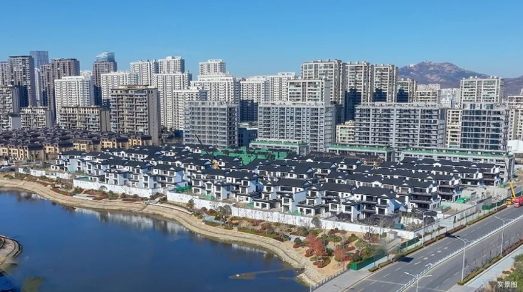 叠墅区域外立面幕墙与石材安装进入收尾,室内抹灰完成,室外管道已铺设。