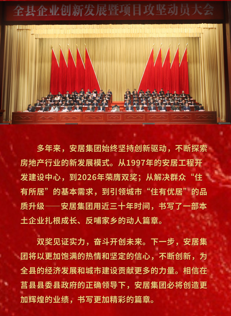 在众多优秀企业中,安居集团荣膺县委、县政府颁发的“2025年高质量发展杰出企业”称号,旗下雅居建筑公司荣获“2025年高质量发展优秀企业”称号。据悉,会上通报表扬了2家“2025年高质量发展功勋企业”、12家“2025年高质量发展杰出企业”以及70家“2025年高质量发展优秀企业”。集团董事长柴松军、雅居建筑公司总经理闫海洋作为受表彰企业代表在主席台就座,以无声的荣耀彰显了企业的社会地位。