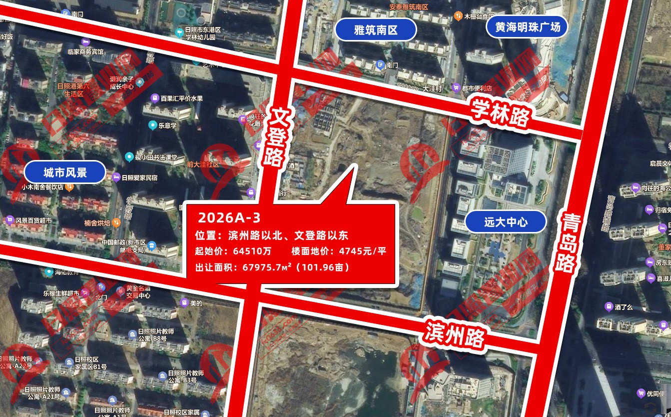 2026A-3号地块位于滨州路以北、文登路以东,面积101.96亩,起始价6.451亿元,楼面地价4745元/平米,容积率2.0。