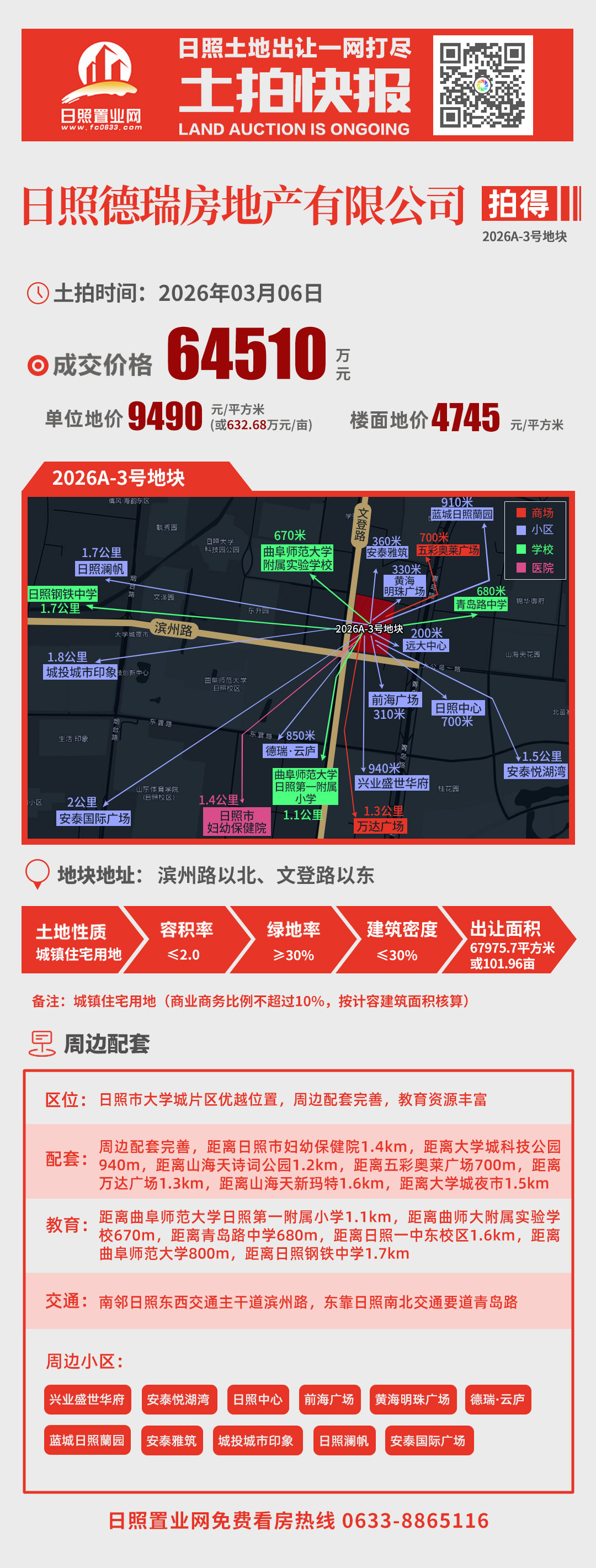 其中,日照德瑞房地产有限公司以6.451亿成功竞得2026A-3号地块。